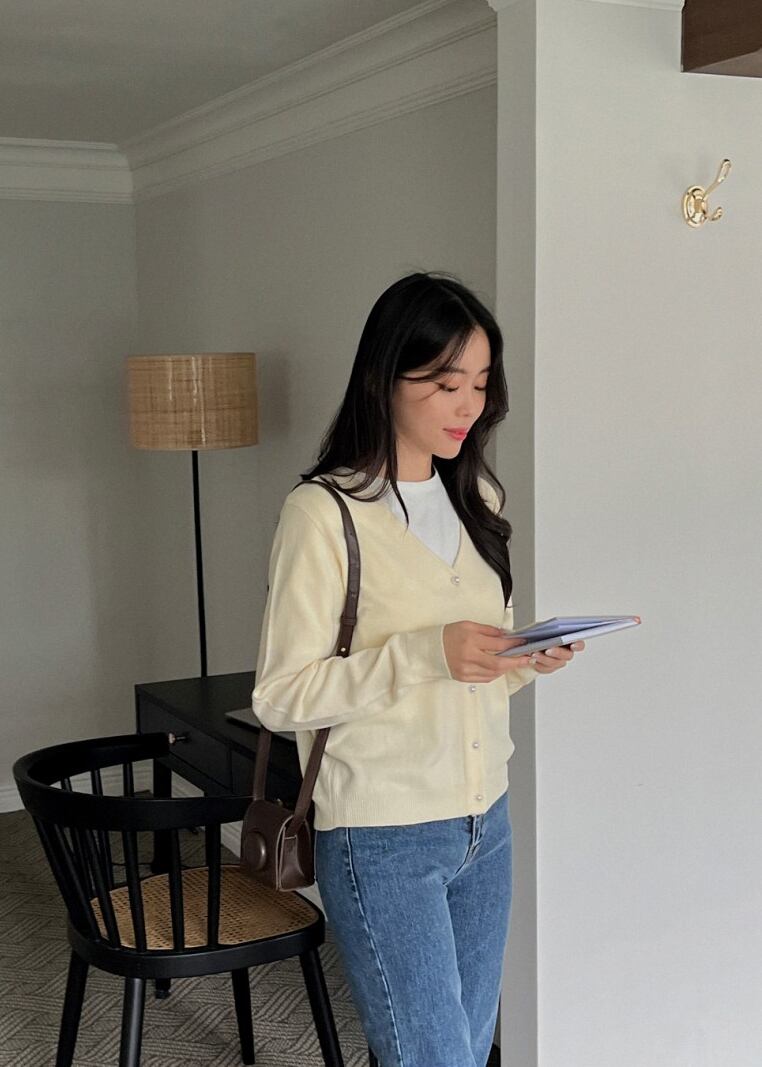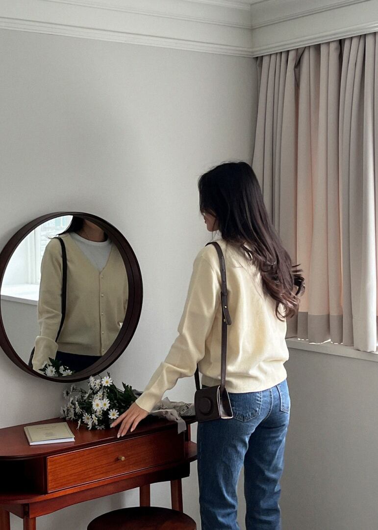 エレガントな上品さをプラス。パールボタンがアクセントになったニットカーディガン。フォーマルな場面でもカジュアルな場面でも活躍します。細身で洗練されたシルエットで、大人っぽい雰囲気を演出します。
