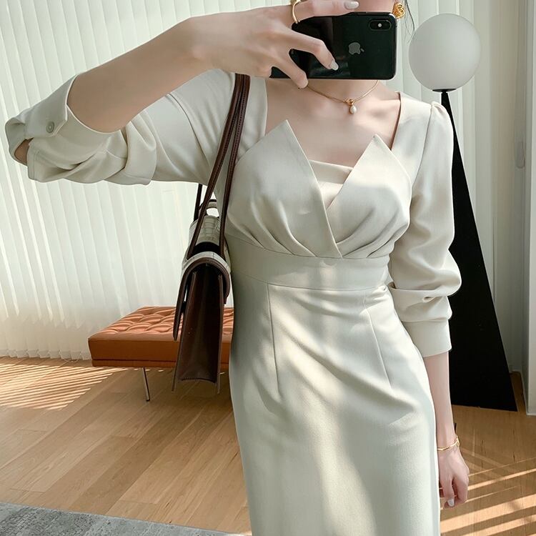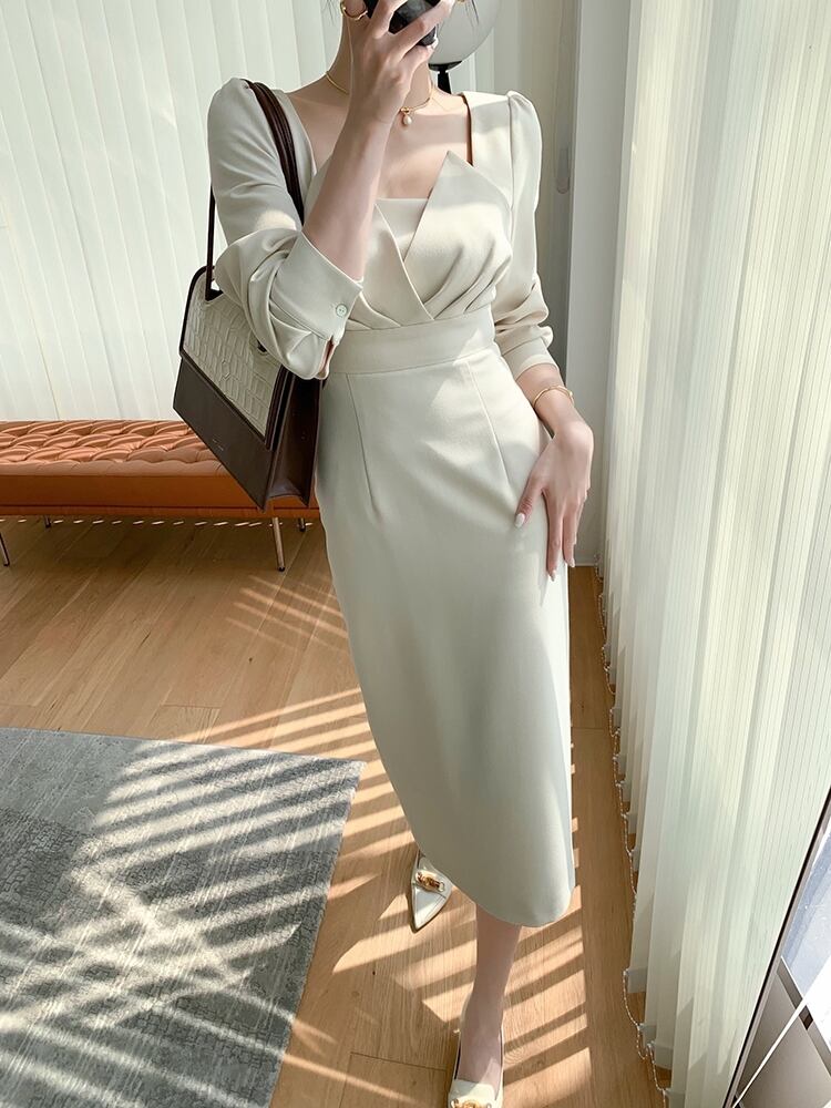 ドレス パーティードレス ミモレ丈 長袖 Vネック Aライン タイト スリム 細身 スリット ハイウエスト かわいい 大人可愛い きれいめ シンプル 大人 上品 おしゃれ 大人女子 キュート ガーリー セクシー エレガント 主役級 ゴージャス 華やか 無地 20代 30代 40代 50代 レディース デート お出かけ パーティー イベント ホテル レストラン 韓国系 ファッション コーデ 脚長 高見え トレンド 流行 インスタ映え 秋 結婚式 2次会 卒業式 S M L XL ホワイト ブラック