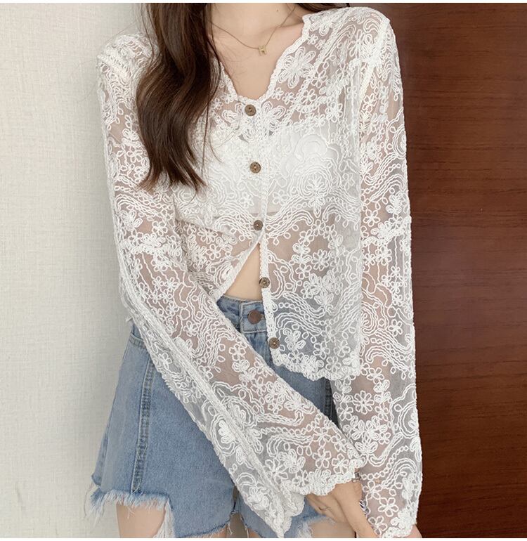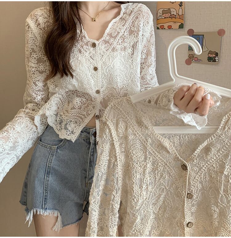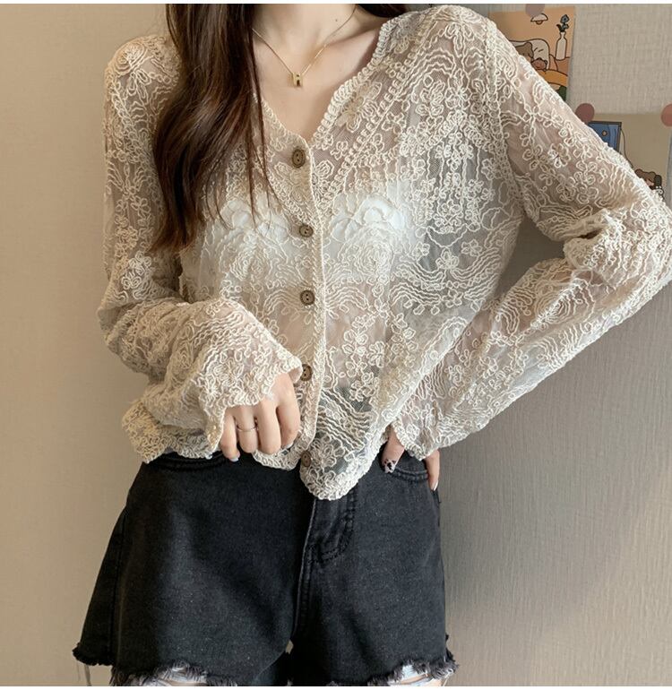 トップス レース ブラウス レギュラー丈 袖あり 長袖 フレアスリーブ Vネック 襟なし スリム タイト 細身 刺繍 チュール 前開き 透け感 シースルー 伸縮性 かわいい 大人可愛い きれいめ シンプル カジュアル 大人 上品 おしゃれ レトロ 大人女子 こなれ感 ラフ ラブリー キュート ガーリー ルーズ 個性的 セクシー エレガント 抜け感 無地 春 夏 10代 20代 30代 レディース 女性用 デート お出かけ 女子会 休日 着回し 普段使い 重ね着 お揃い 双子 韓国 オルチャン インスタ映え