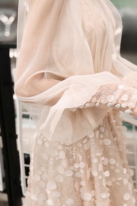 シフォン地のシースルーが透明感を感じさせてくれる柔らかな印象のドレスワンピース。ふんわりとした全体のシルエットは、動きに合わせて華やかに踊ります。バスト部分にはギャザーが配され上品なドレープを作り出しています。切替デザインのドレスワンピは、ワントーンながら個性あふれる印象に。花びらを装飾したようなスカートデザインは愛らしく、デザインにもアクセントをプラスしてくれます。