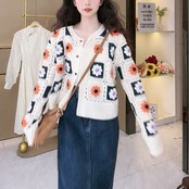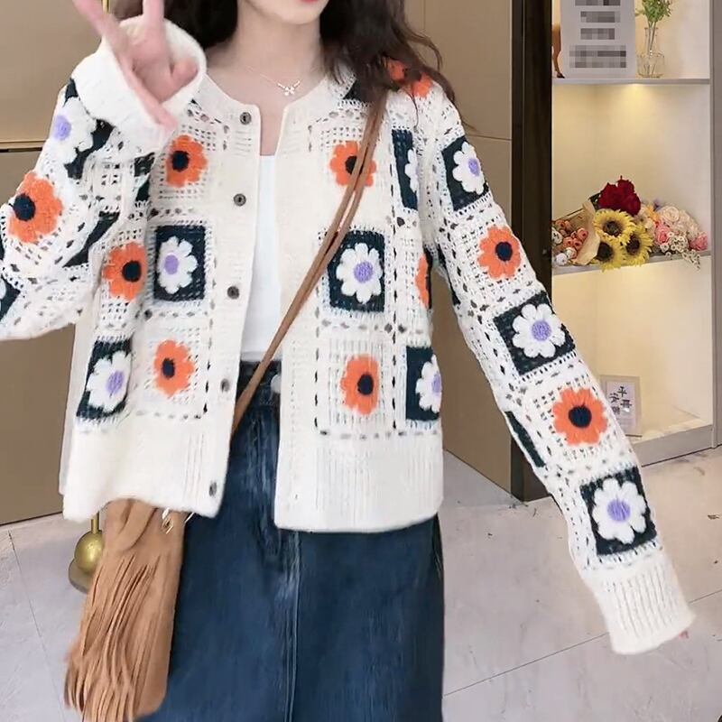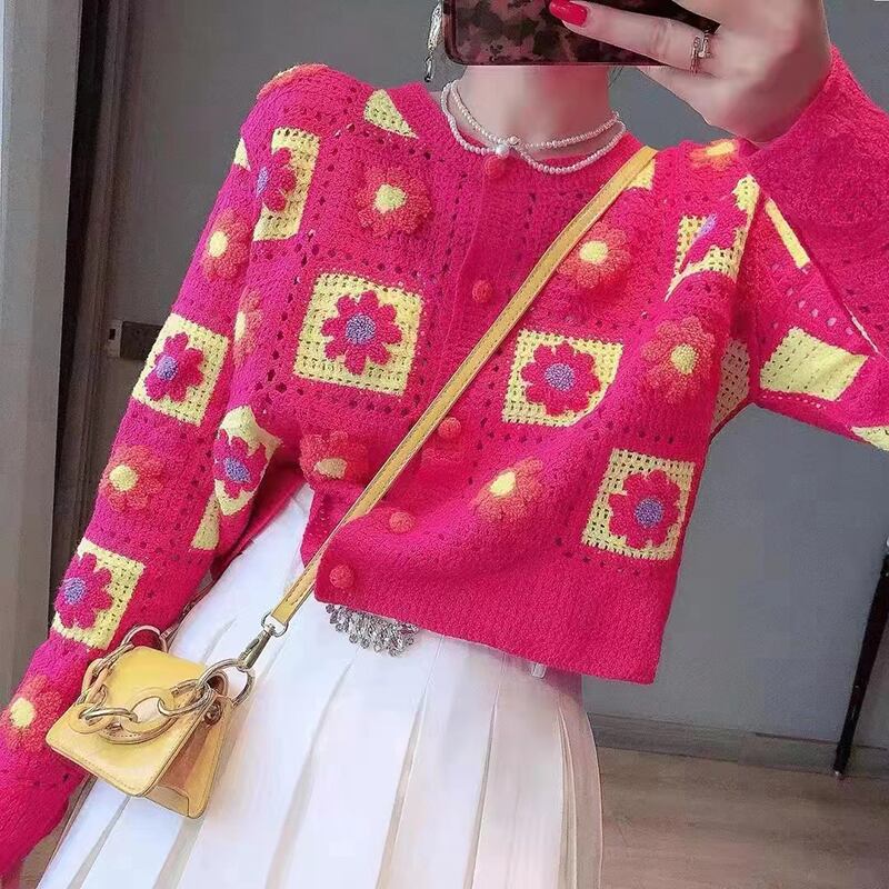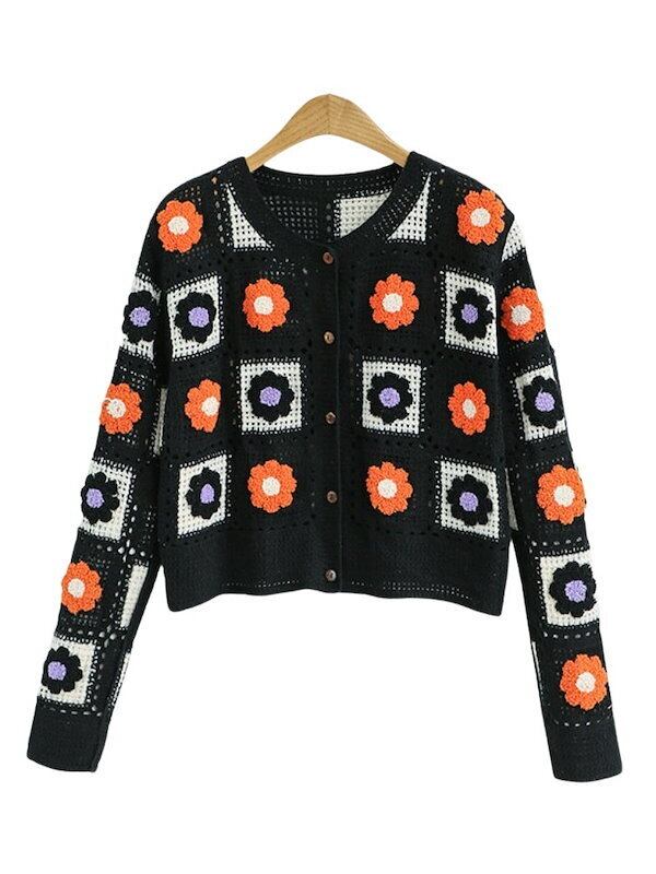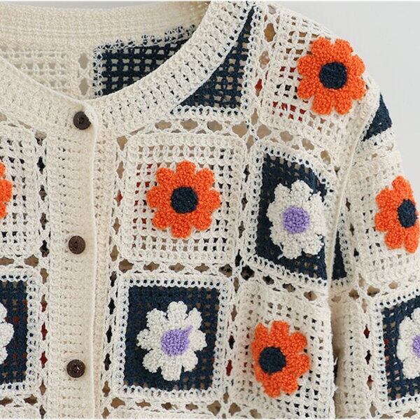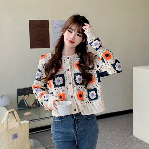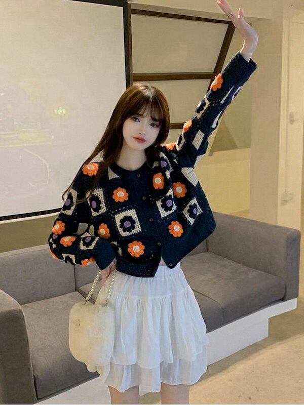 カラフルで立体感のあるお花モチーフがレトロかわいいカーディガン。