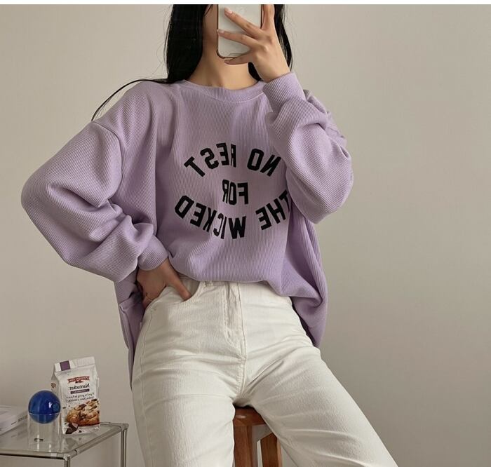 トップス プルオーバー スウェット 長袖 ドロップショルダー 萌袖 クルーネック カジュアル ラフ メンズライク マニッシュ ボーイッシュ スポーティー ロゴ 学生 通学 お出かけ 女子会 お泊まり 休日 着回し 普段使い 重ね着 フリーサイズ パープル グレー イエロー