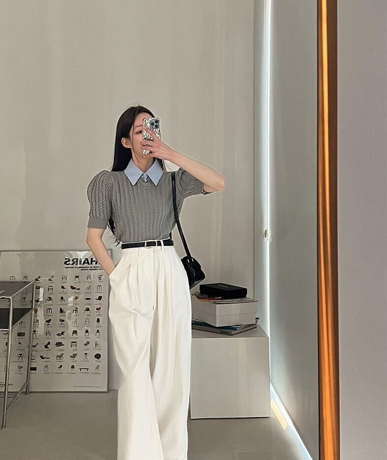 トップス シャツ ブラウス カットソー ニットソー セーター プルオーバー ミニ ミニ丈 ショート ショート丈 袖あり 半袖 ボリューム袖 パフスリーブ Vネック 襟付き ポロカラー スリム タイト 細身 裾イン レース ケーブルニット クロシェ 編み込み 透け感 ニット サマーニット 薄手 かわいい 大人可愛い ラブリー キュート ガーリー 無地 春 夏 お出かけ 休日 アウトドア レストラン ショッピング 着回し 普段使い モテ フリーサイズ ワンサイズ 灰色 グレー イエロー ネイビー