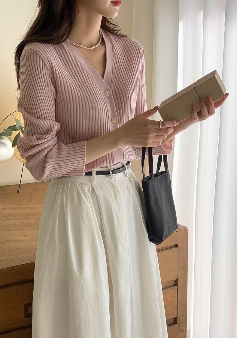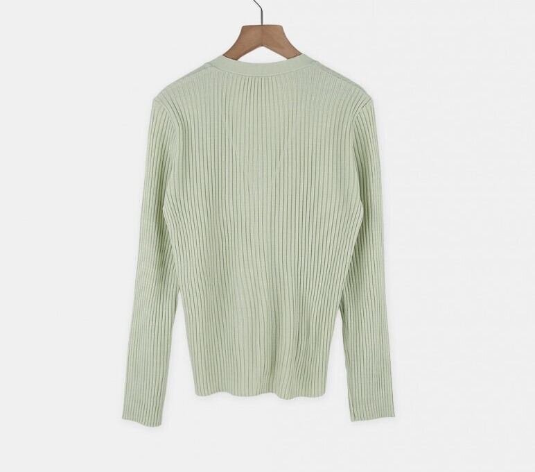 Vネックラインと太目のリブ模様がすっきりしたシルエットに見せてくれます♪