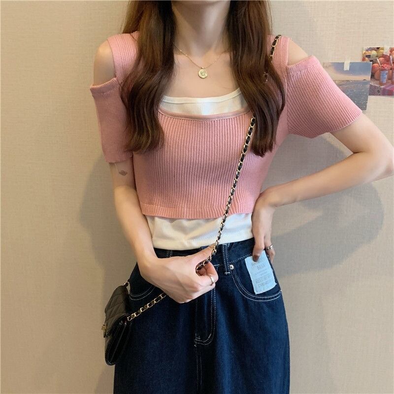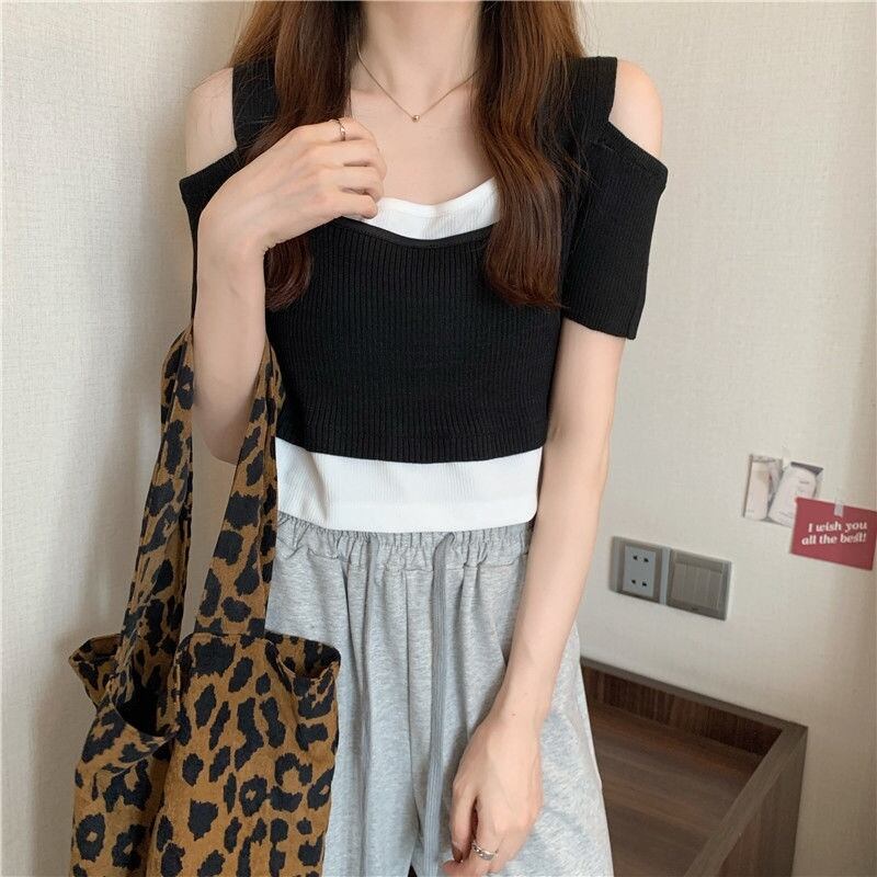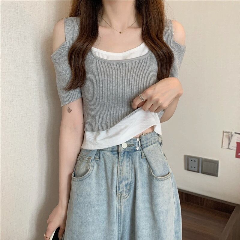 レーヤードデザインがオシャレなショート丈カットソー。タンクトップ感覚で着られる肩開きデザインで、デコルテラインを綺麗に見せてくれます。コンパクトなシルエットで、スカートなど様々なボトムにマッチする優秀な1枚です。
