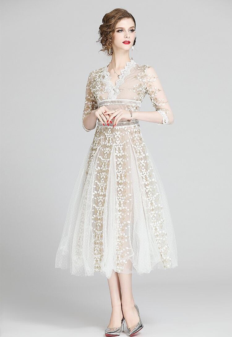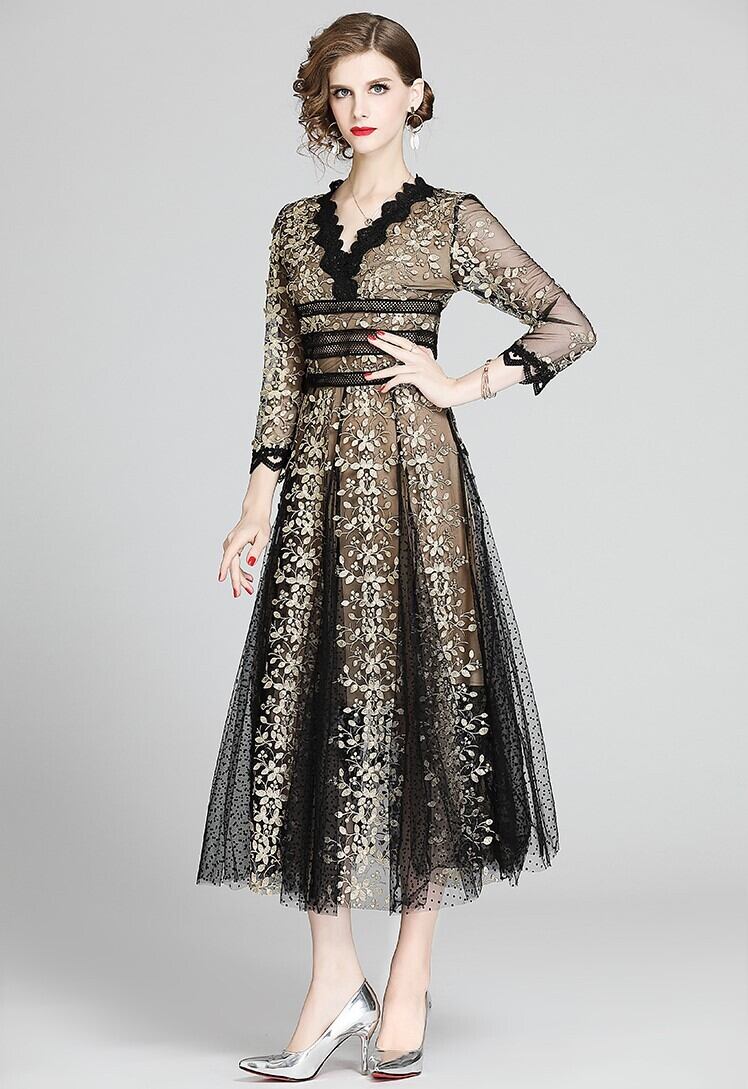 ドレス ワンピース ワンピ ロング ロング丈 アンクル丈 9分丈 ミディアム丈 Aライン フレア 袖あり長袖 Vネック 花柄 フラワー 総レース レース レディース 上品 きれいめ かわいい 大人可愛い お洒落 おしゃれ 大人女子 エレガント コーデ 存在感 主役級 個性的 こなれ感 抜け感 韓国 オルチャンお嬢様 華やか ゴージャス クラシック 結婚式 二次会 披露宴 パーティー パーティ 20代 30代 40代 春 秋 冬 大きめサイズ S M L XL 2XL 白 ホワイト 黒 ブラック ゴールド