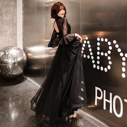 ワンピース イブニングドレス パーティードレス ワンピドレス ロング ロング丈 長袖 スタンドカラー フレア スリム 細身 レース フリル ウエストマーク バックシャン バックコンシャス 透け感 シースルー きれいめ 上品 おしゃれ かっこいい 大人女子 ガーリー 個性的 セクシー エレガント 主役級 存在感 セレブ 春 夏 秋 冬 オールシーズン 謝恩会 二次会 クリスマス 20代 30代 40代 レディース 女性用 パーティー イベント 脚長 S M L XL 2XL 大きいサイズ ブラック