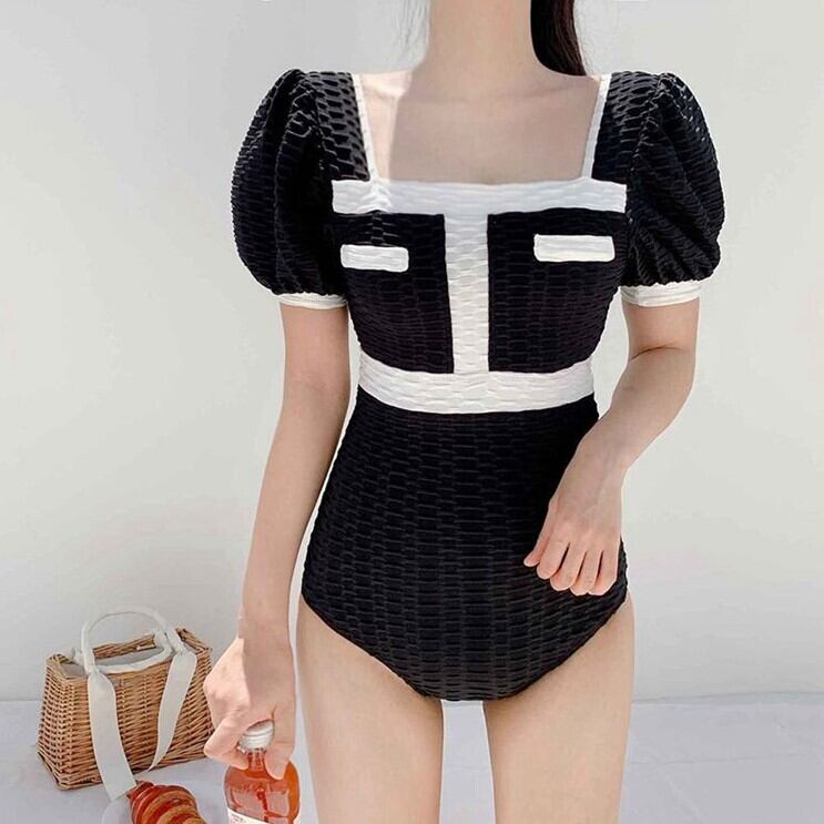 半袖デザインで上半身をカバーしつつ、美しい谷間を作り出し、女性らしいボディーラインを演出してくれます。高めの位置に配置されたハイウエストデザインは、脚長効果も期待でき、美脚も叶えてくれます。