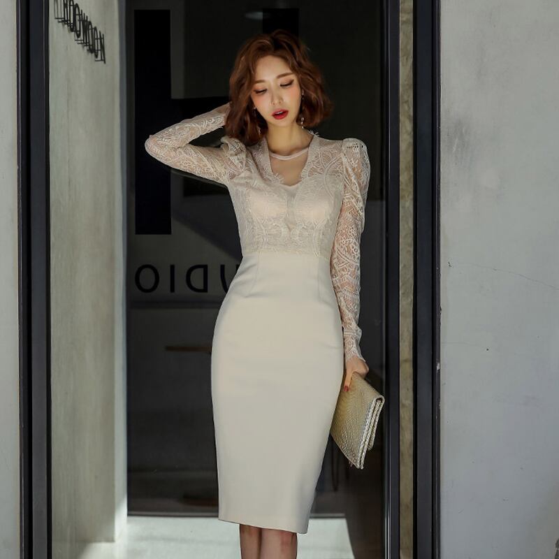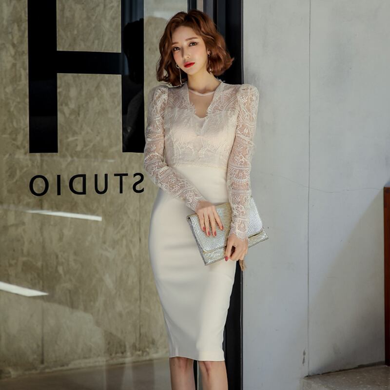 ワンピース デート ワンピドレス 膝丈 ひざ丈 袖あり 長袖 スリム タイト 細身 レース バックスリット 透け感 大人可愛い きれいめ 大人 上品 おしゃれ お洒落 大人女子 こなれ感 クール セクシー エレガント 存在感 無地 春 夏 二次会 20代 30代 レディース 女性用 デート 女子会 パーティー イベント ホテル レストラン ファッション コーデ スタイル モテ トレンド 流行 インスタ映え S M L XL ジャスト サイズ 白 ホワイト 黒 オフホワイト 大人カラー パフスリーブ