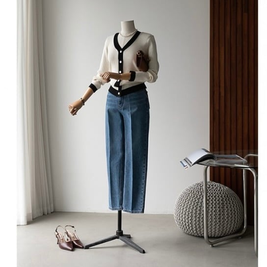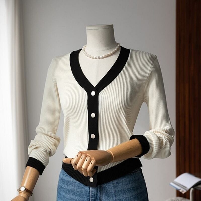 バイカラートリミングとシルバーボタンの合わせがクラシカルなカーディガン。