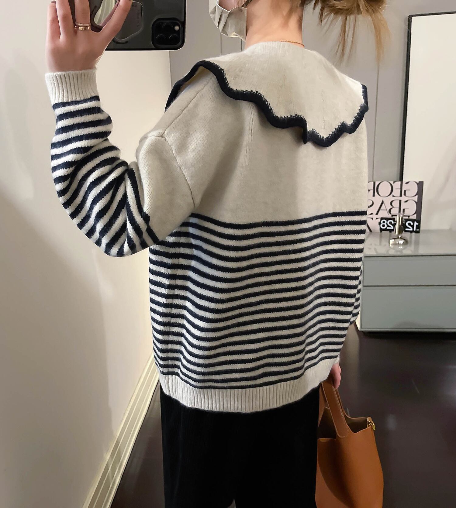 トップス カーディガン 袖あり 長袖 萌袖 襟付き フリル 前開き 伸縮性 ニット かわいい 大人可愛い きれいめ シンプル カジュアル 大人 上品 おしゃれ レトロ 大人女子 こなれ感 ラフ ラブリー キュート ガーリー ルーズ 個性的 ボーダー 春 秋 冬 10代 20代 30代 レディース デート お出かけ 女子会 着回し 普段使い 重ね着 韓国 オルチャン ファッション コーデ スタイル トレンド インスタ映え くすみカラー