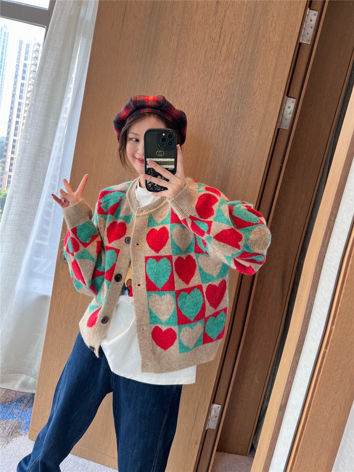 大胆なハートデザインがインパクトのあるニットカーディガン。