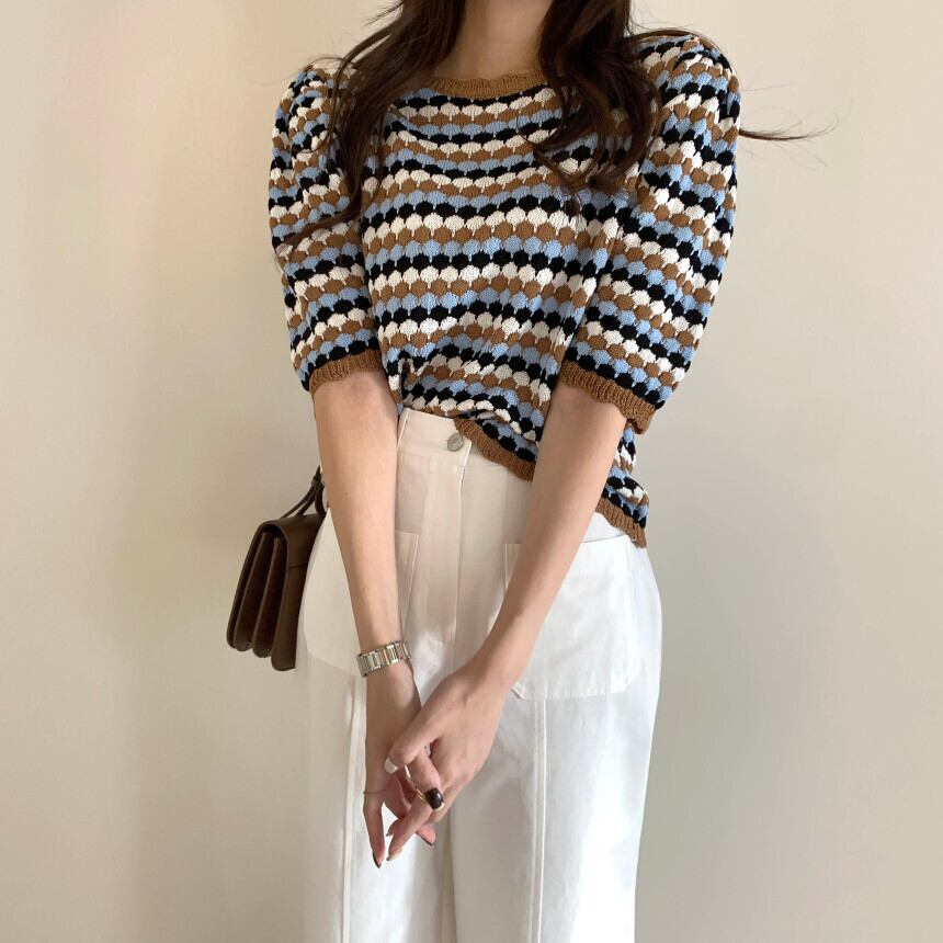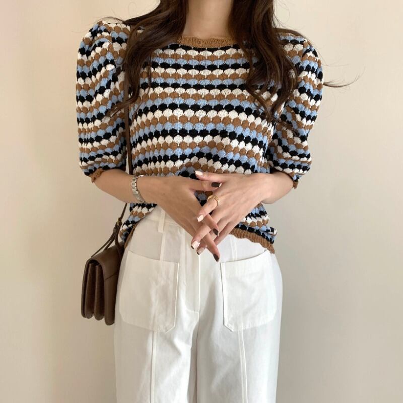 トップス ニットソー キャミソール ショート ショート丈 袖あり 半袖 パフスリーブ Uネック ラウンドネック 襟なし 伸縮性 かわいい 大人可愛い きれいめ シンプル カジュアル 大人 上品 おしゃれ 大人女子 こなれ感 ラフ エレガント モダン ボーダー 春 夏 10代 20代 30代 レディース デート お出かけ 女子会 着回し 普段使い 重ね着 韓国 オルチャン ファッション コーデ スタイル トレンド インスタ映え くすみカラー