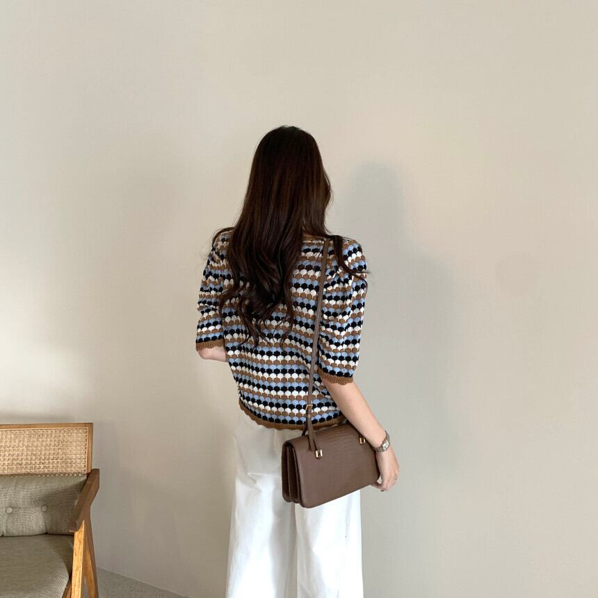 個性的なボーダー柄が大人可愛い半袖ニット。