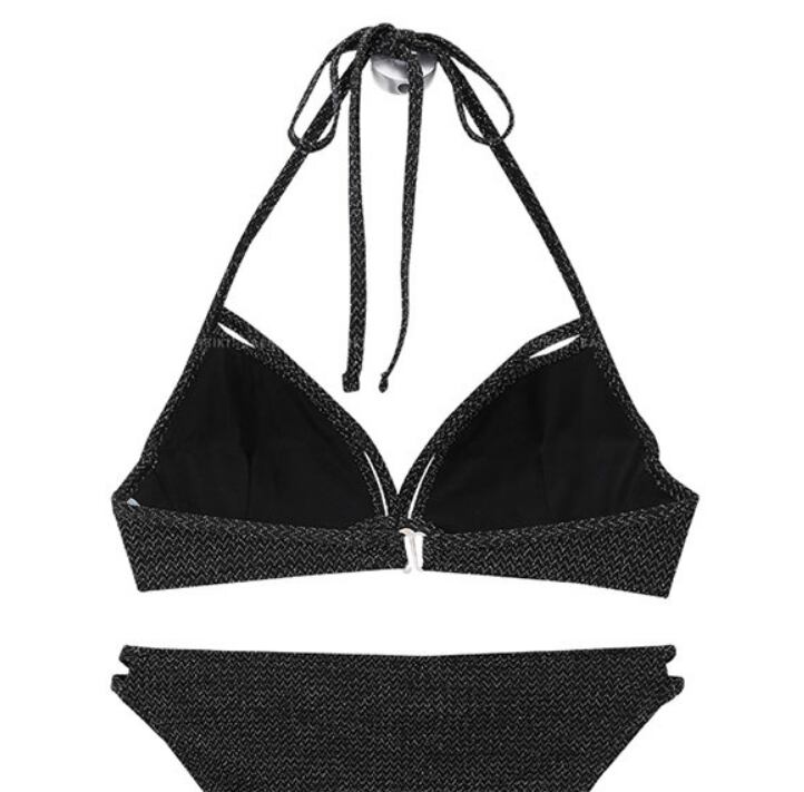 胸元のストラッピーデザインがスタイリッシュでクールなビキニです。シンプルなデザインながらグリッターのラメ感が大人可愛くセクシーな印象に。ホルターネックが華奢に見せてくれるのも嬉しいポイント◎
