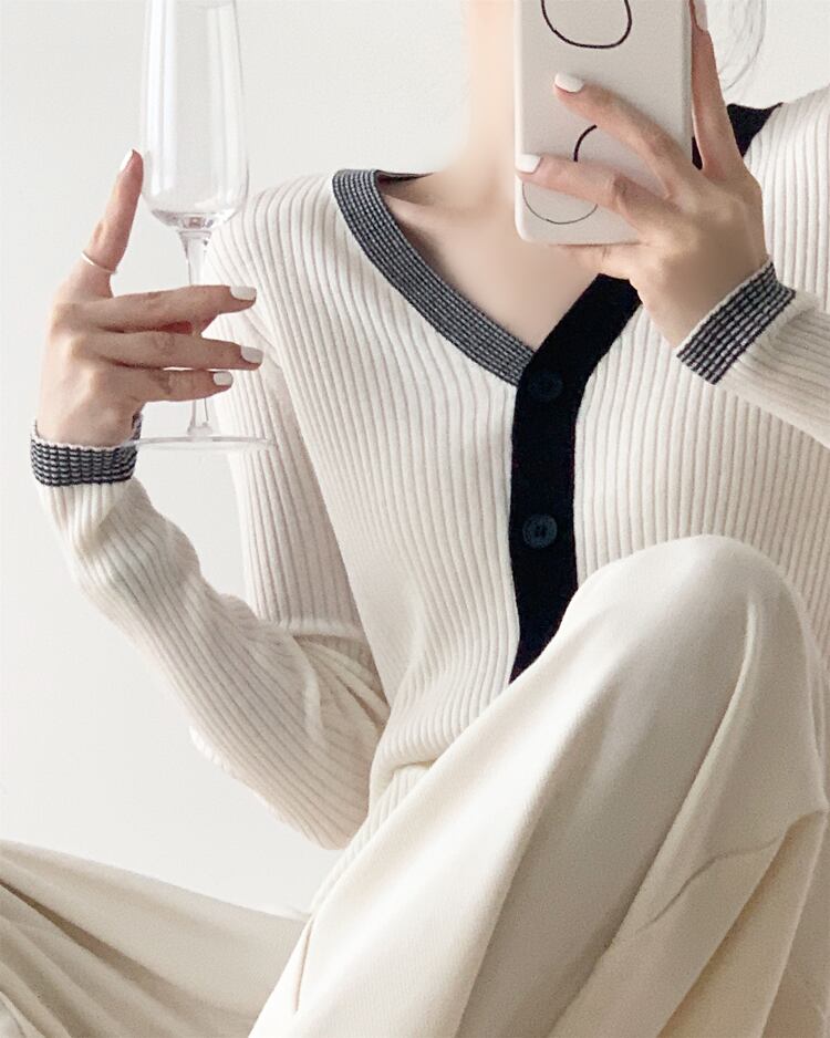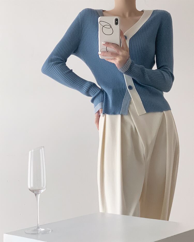 バイカラーデザインがさりげない個性を演出してくれるカーディガン。