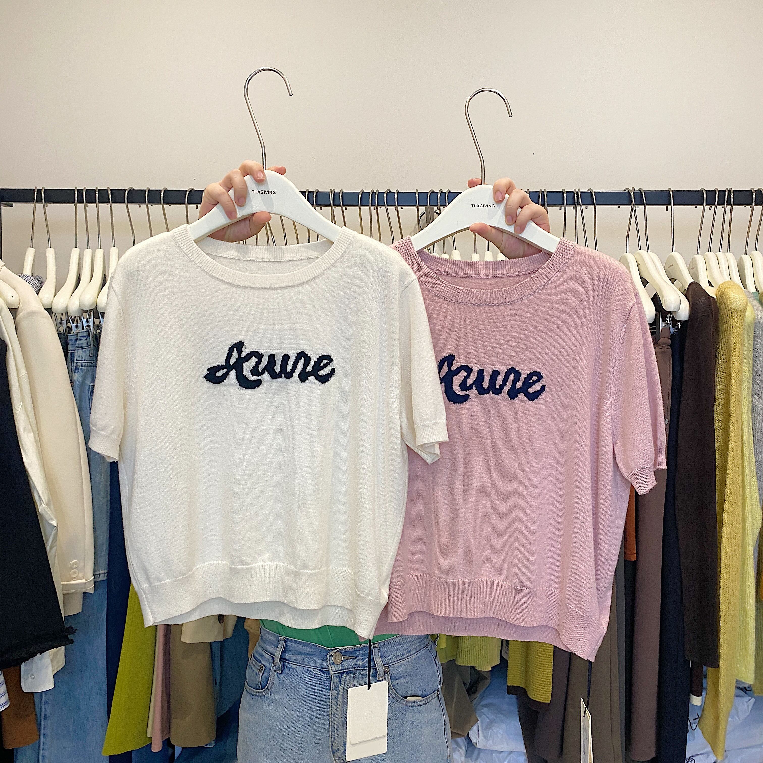 フロントのロゴデザインが海外ファッション風の半袖ニット。
