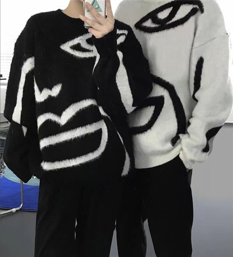 大胆に描かれたイラストが個性的でかっこいいニットセーター。ユニセックスなのでペアで着用していただくことも可能です。普通のコーデに飽きてきたおしゃれさんにおすすめの一枚。