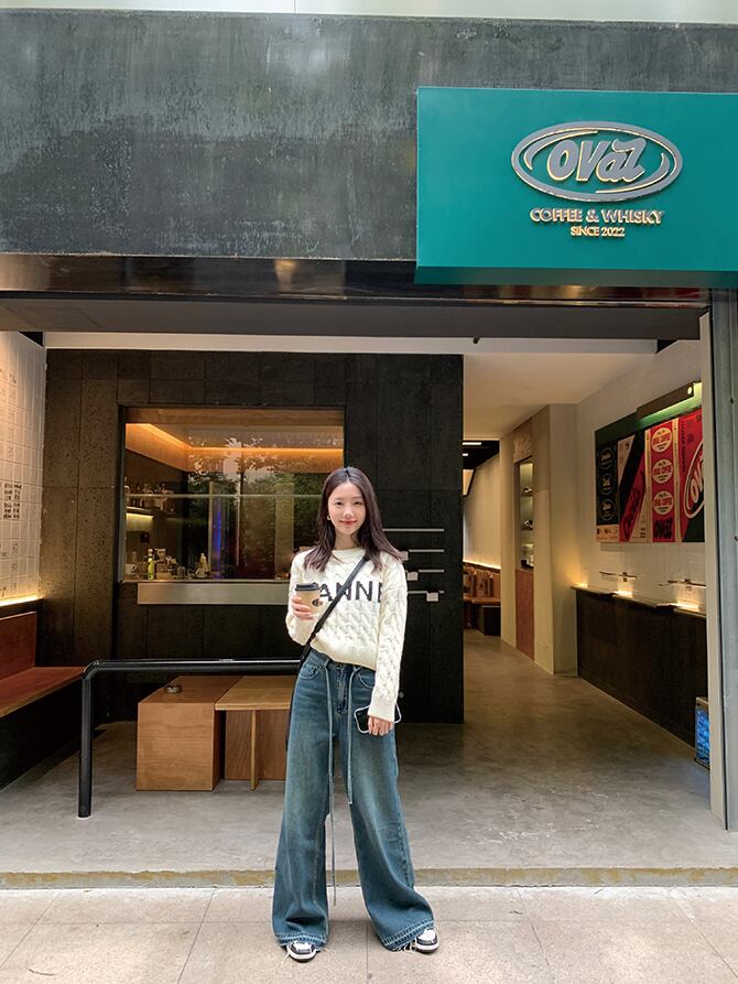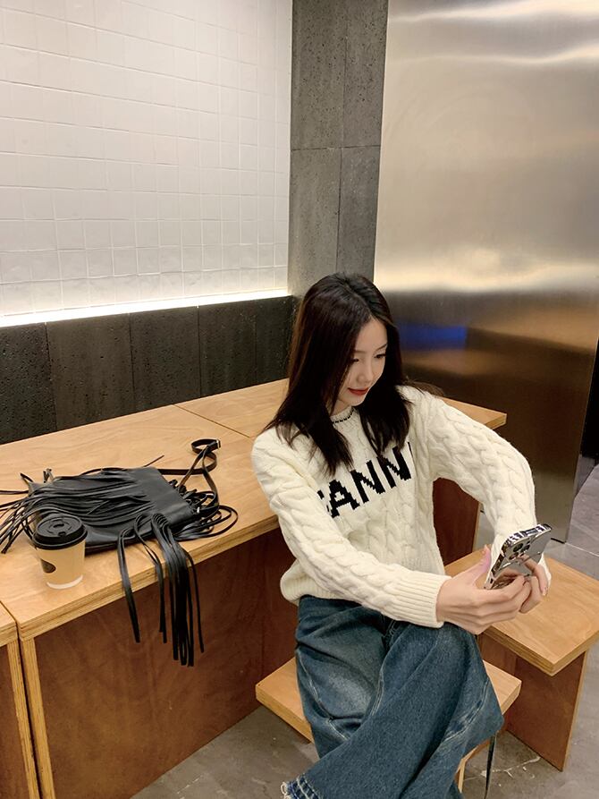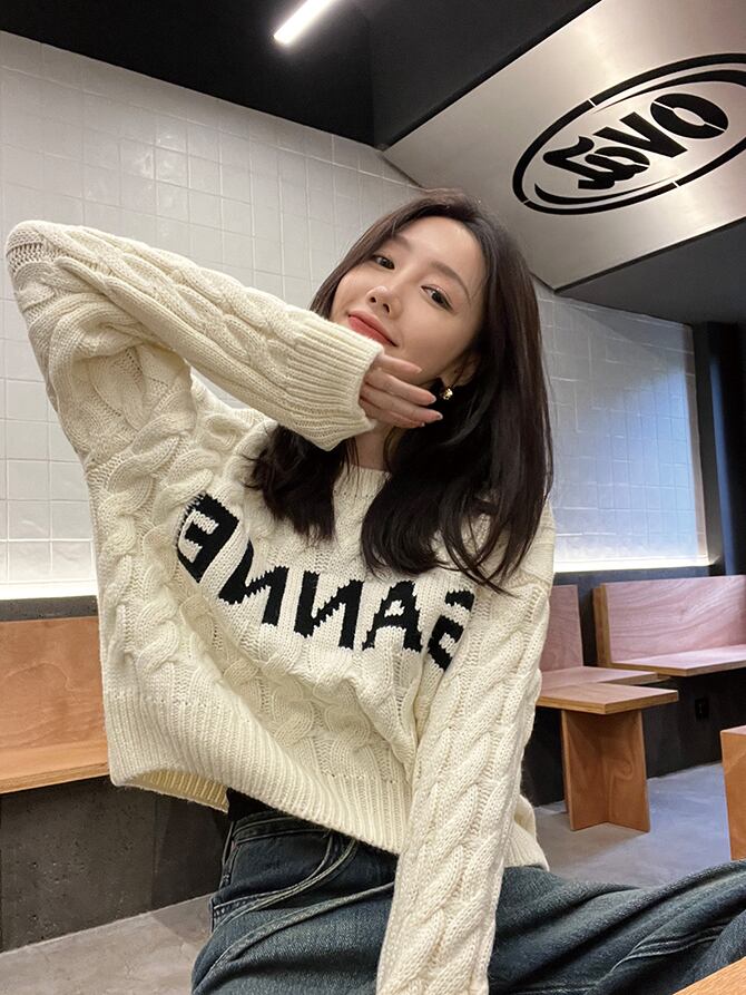 大きめロゴが可愛い、ケーブルニットセーター。スカートにもパンツにも合わせやすい丈感で、コーディネートの幅が広がります。一枚で来ても様になるデザイン。