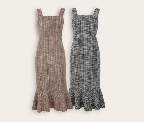 ツイードのミモレ丈ワンピースは、春から秋にかけて着られる人気のアイテムです。袖なしでラウンドネックのシンプルなデザインなので、大人可愛いコーディネートに仕上がります。セミフレアのAラインシルエットが女性らしく、切り替えデザインで脚長効果も抜群です。