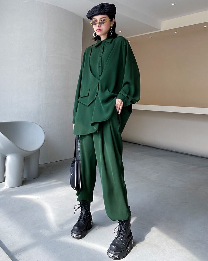 セットアップ トップス ボトムス パンツ シャツ ワイドパンツ ストレートパンツ ロング ロング丈 袖あり 長袖 襟付き ストレート ワイド 前開き 薄手 上下セット ツーピース シンプル カジュアル おしゃれ かっこいい レトロ ラフ メンズライク ルーズ 個性的 クール モード系 存在感 とろみ感 抜け感 無地 春 秋 10代 20代 30代 レディース 女性用 ユニセックス お出かけ アウトドア イベント ダンス お出かけ ショッピング 着回し 重ね着 楽ちん 体型カバー ブラック グリーン