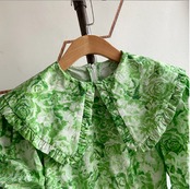 大きな襟がフリル付きでキュート!フラワープリントで上品でかわいらしい雰囲気があり、カジュアルから上品な場面までお使いいただけます。