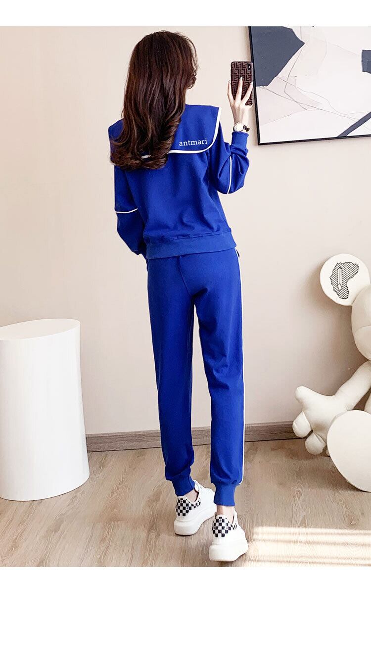 大きなセーラーカラーがかわいいセットアップです。大きなカラーで顔回りの小顔効果アップ。ジャージ素材を使用しているので、動きやすく快適に着用できます。カラーは黒とブルーの2色から選べます。