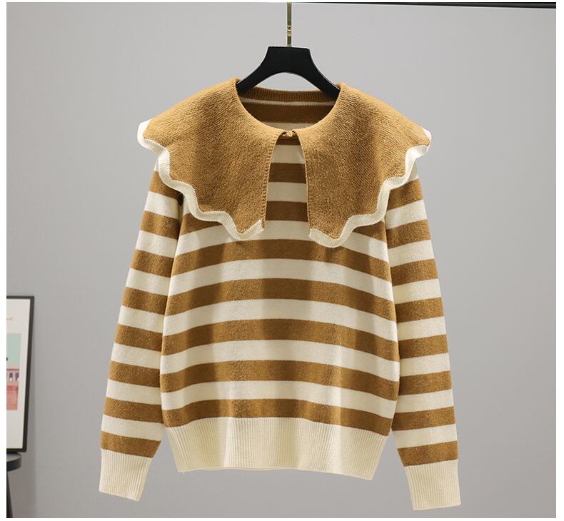 大きな襟が個性的で可愛いニットセーター。ボーダーでカジュアルさもプラスされ、一枚で大人可愛いコーディネートが完成します。スカートに合わせてガーリーに、パンツに合わせてカジュアルに、色々なコーディネートが楽しめます。