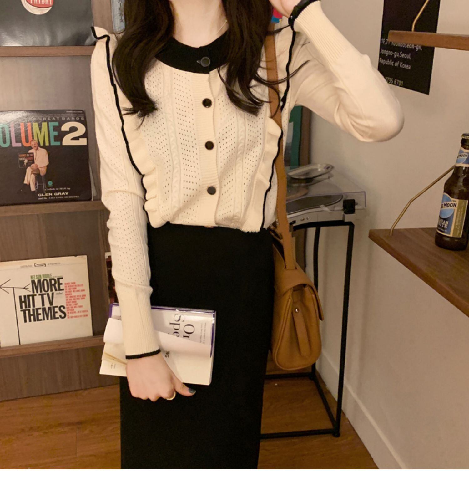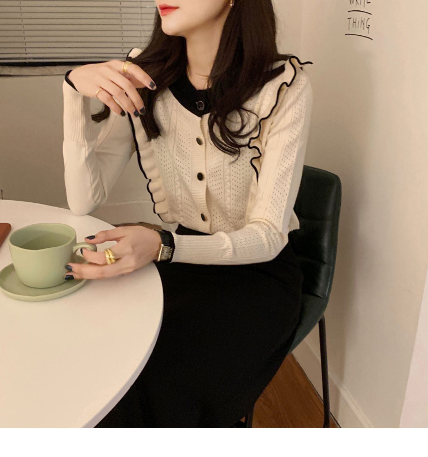 トップス カットソー ニットソー プルオーバー カーディガン 袖あり 長袖 ラウンドネック パワーショルダー スリム 細身 フリル 前開き リブニット クロシェ 編み込み 透け感 ニット 厚手 かわいい 大人可愛い きれいめ 大人 上品 おしゃれ レトロ ラブリー キュート ガーリー 柄 ドット柄 秋 冬 10代 20代 30代 レディース オフィス ビジネス OL 通勤 学生 通学 デート お出かけ 休日 ホテル ガーデン レストラン 着回し 普段使い モテ S M L バイカラー アプリコット