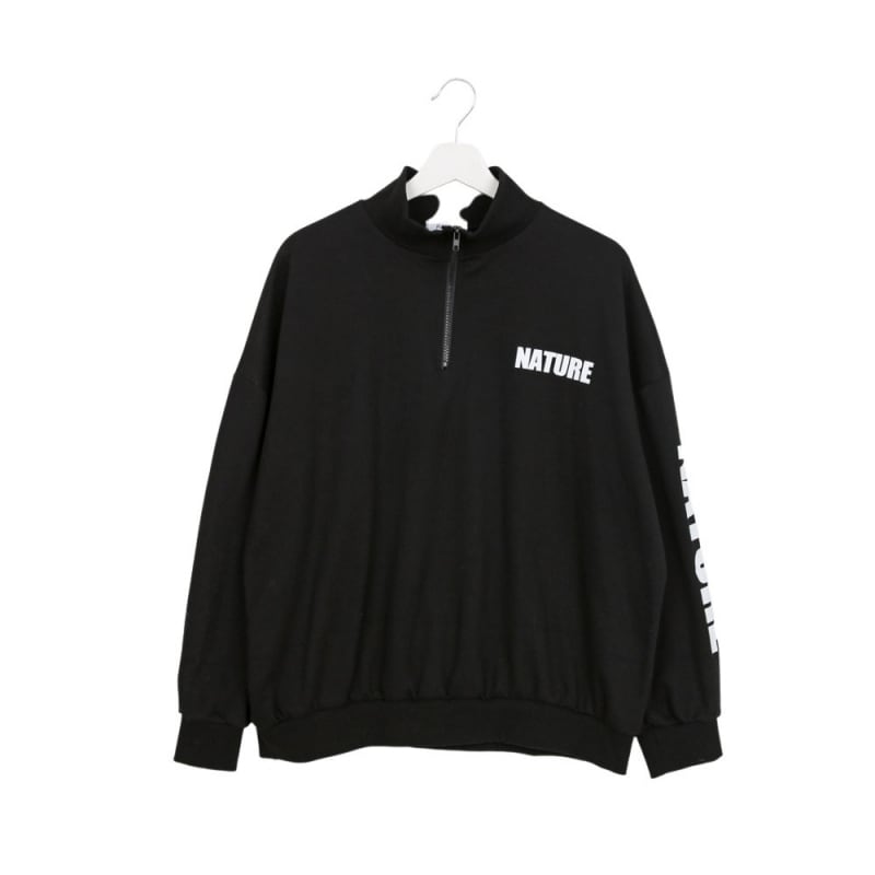 トップス プルオーバー トレーナー 長袖 ドロップショルダー ハイネック ジップアップ カジュアル かっこいい ラフ メンズライク マニッシュ ボーイッシュ スポーティー ルーズ クール プリント 学生 通学 女子会 休日 着回し 普段使い 重ね着 楽ちん フリーサイズ 黒 グレー ベージュ