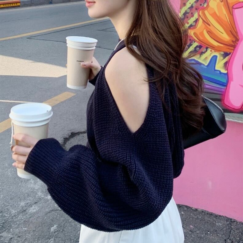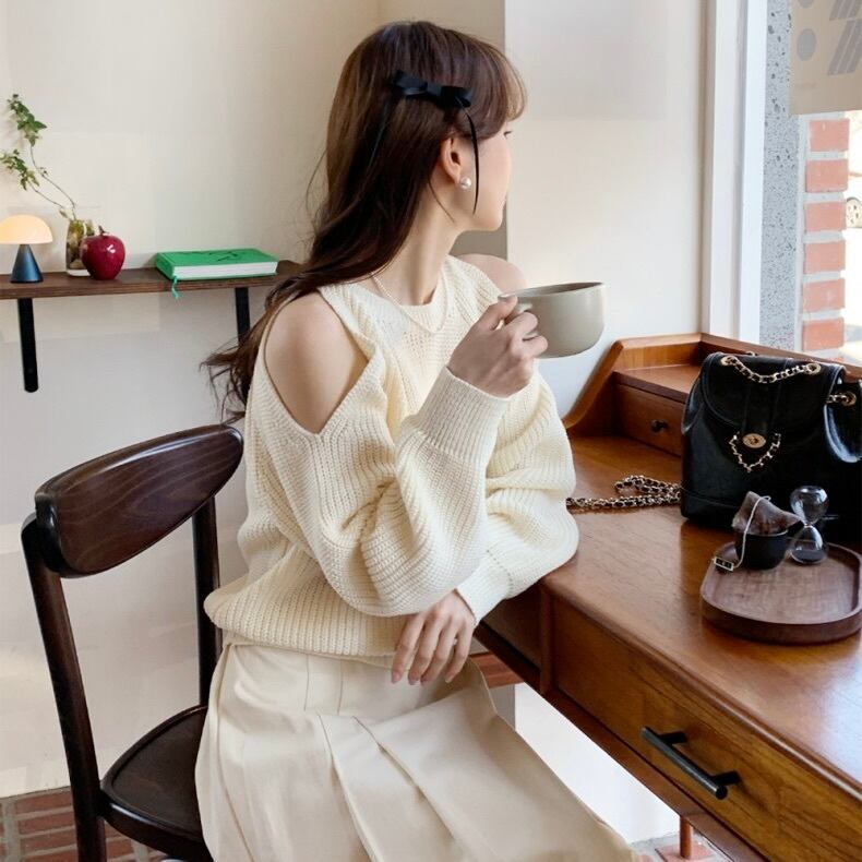 オープンショルダーデザインがトレンド感満載のニットトップス。