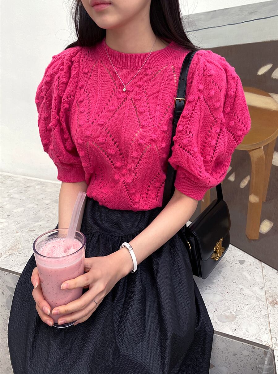 透かし編みとパフスリーブが上品でエレガントなニットプルオーバーです!