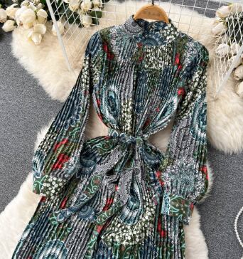 ワンピース フレアワンピース ロング ロング丈 マキシ マキシ丈 9分丈 袖あり 長袖 襟なし フリル リボン ベルト ウエストマーク ウエストリボン 大人可愛い カジュアル 大人 上品 おしゃれ お洒落 レトロ アジアン ラフ ラブリー キュート ガーリー モード系 セクシー エレガント 主役級 存在感 柄 オールシーズン 10代 20代 レディース 女性用 ママ 女の子 パーティー イベント 韓国 韓国系 ファッション コーデ スタイル モテ 美脚 脚長 フリーサイズ 緑 グリーン アプリコット