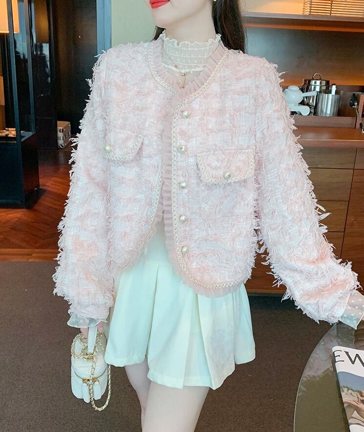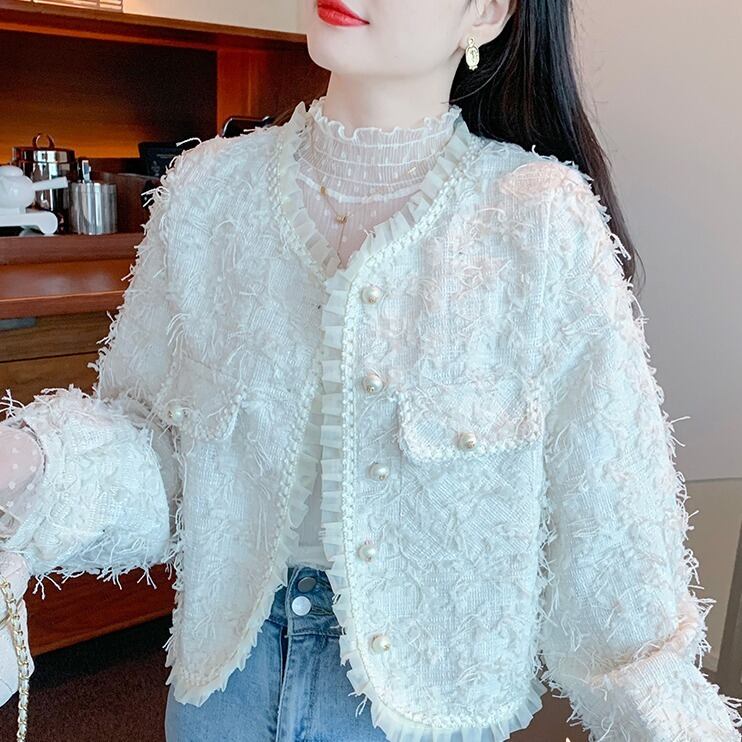 アウター ジャケット レギュラー丈 袖あり 長袖 Vネック 襟なし ノーカラー フリル ポケット 前開き きれいめ シンプル カジュアル 大人 上品 おしゃれ レトロ キュート 個性的 エレガント 存在感 都会的 ラグジュアリー ハイエンド ドレッシー 清楚 無地 春 秋 結婚式 二次会 20代 30代 40代 50代 60代 レディース 女性用 OL デート お出かけ パーティー 旅行 ホテル レストラン 婚活 合コン 着回し 普段使い 韓国系 楽ちん モテ 体型カバー ゆったり ホワイト ピンク