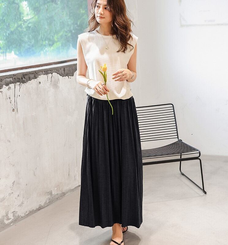 さらりと揺れる、シンプルな細プリーツのロングスカートです。