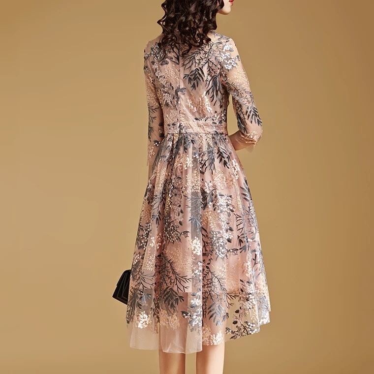 ドレス ワンピース フレアワンピース ワンピドレス 膝丈 ひざ丈 袖あり 5分袖 五分袖 ラウンドネック 襟なし フレア Aライン 刺繍 シフォン 透け感 シースルー シアー 大人可愛い きれいめ カジュアル 上品 おしゃれ レトロ こなれ感 ラブリー キュート 個性的 存在感 都会的 ラグジュアリー ハイエンド ドレッシー 花柄 フラワー 春 夏 結婚式 二次会 20代 30代 40代 レディース 女性用 パーティー イベント ホテル レストラン Bar 婚活 楽ちん モテ ピンク ニュアンスカラー