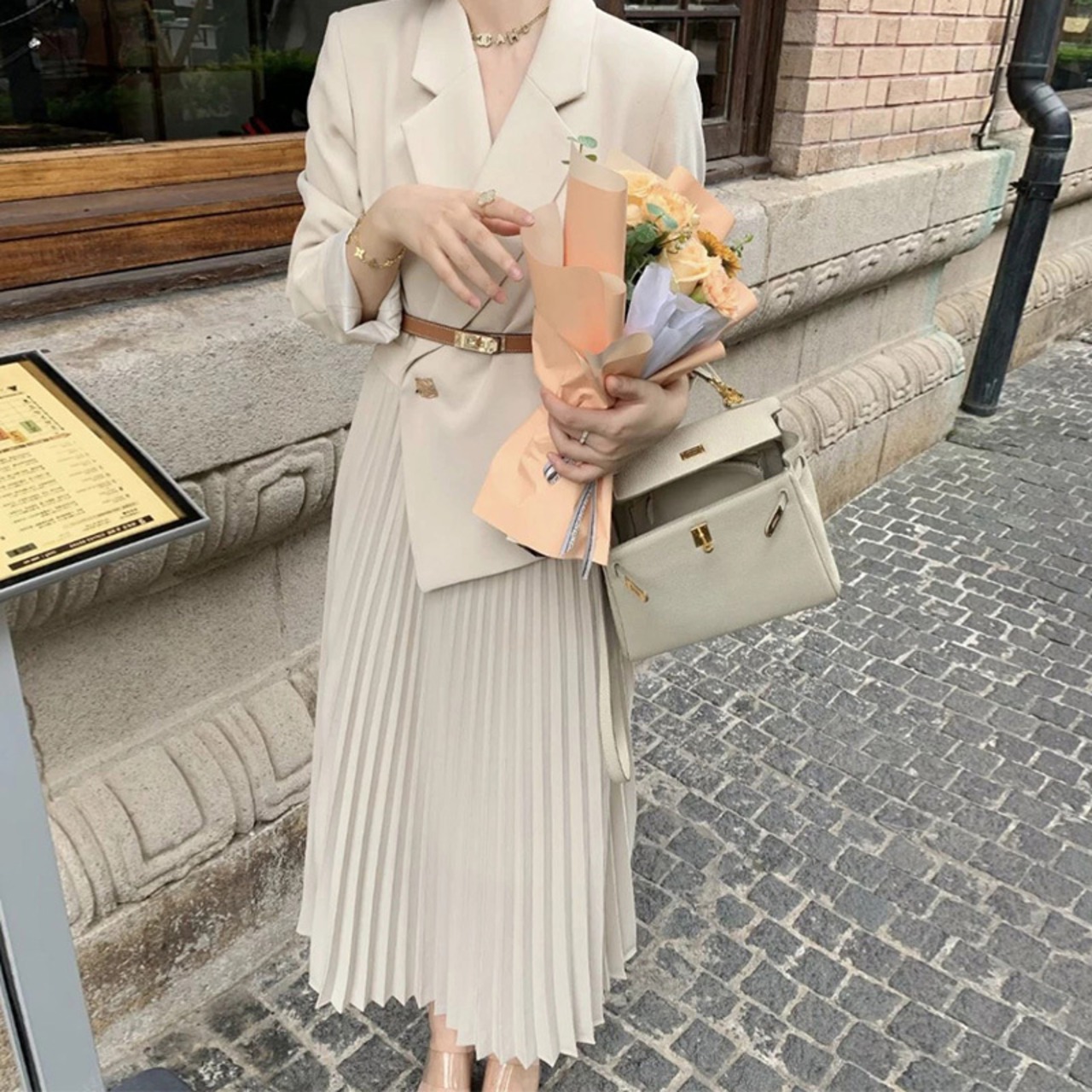セットアップ ツーピース スカート ジャケット スーツ ロングスカート プリーツスカート ロング ロング丈 袖あり 長袖 襟付き プリーツ ベルト 前開き コンサバ 上下セット きれいめ シンプル カジュアル 上品 おしゃれ レトロ こなれ感 個性的 フォーマル 都会的 ラグジュアリー ハイエンド 清楚 無地 春 秋 20代 30代 40代 50代 60代 レディース 女性用 オフィス ビジネス OL 通勤 パーティー ホテル レストラン Bar 婚活 着回し 普段使い 楽ちん モテ ゆとり感 ベージュ