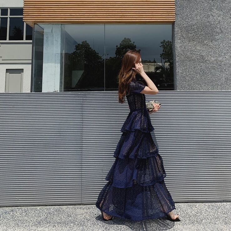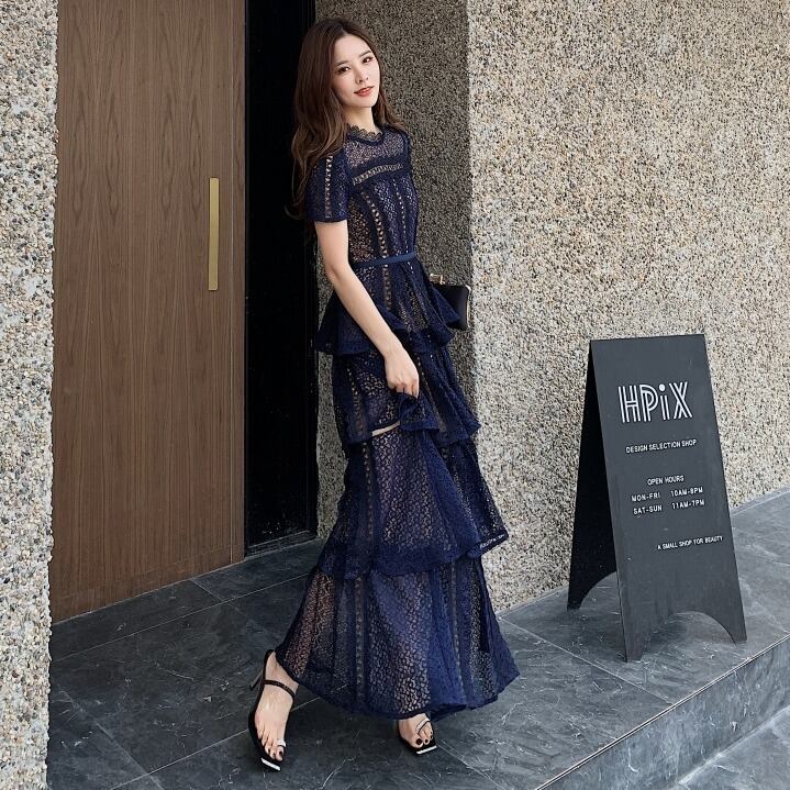 清涼感漂うネイビーのティアードワンピース。透け感のあるレースのテキスタイルが涼し気な印象を与えてくれます。清楚で上品な雰囲気と共に、カジュアルさも兼ね備えたデザインで、幅広いシーンでおしゃれに活躍します。