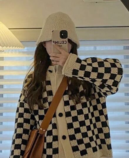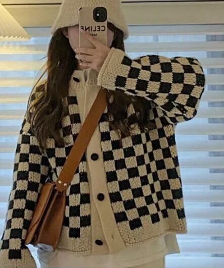 市松模様の編み込みがかわいいボリューム袖カーディガンです♪