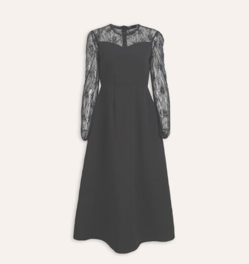 ミモレ丈のレース袖ワンピースは、二次会などのパーティーシーンにぴったりのアイテムです。レースの繊細な美しさと、シフォンの軽やかな素材感で、上品で華やかな印象を与えてくれます。