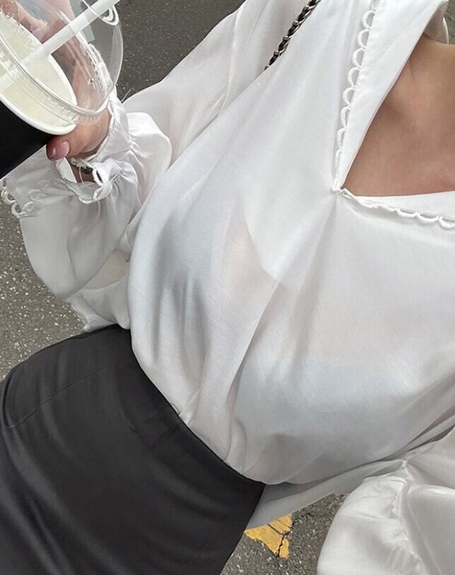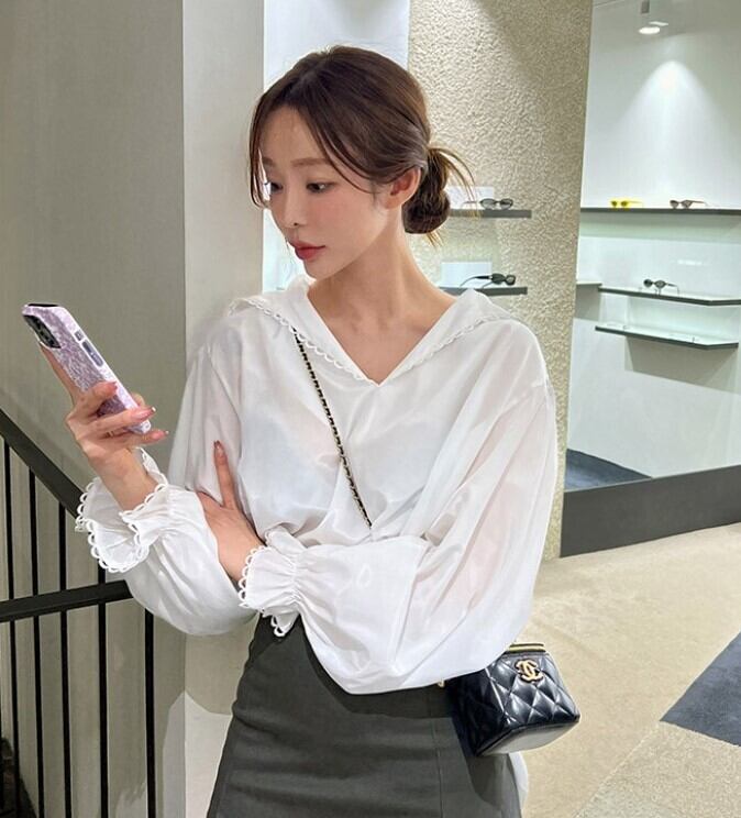 トップス シャツ ブラウス 白シャツ 袖あり 長袖 ボリューム袖 パフスリーブ Vネック 襟付き 透け感 シースルー かわいい 大人可愛い きれいめ シンプル 大人 おしゃれ お洒落 大人女子 こなれ感 モダン 抜け感 無地 春 夏 10代 20代 30代 レディース 女性用 学生 通学 デート お出かけ 女子会 お泊まり 休日 イベント リゾート 旅行 ショッピング 着回し 普段使い 韓国 韓国系 オルチャン ファッション コーデ スタイル 楽ちん ホワイト
