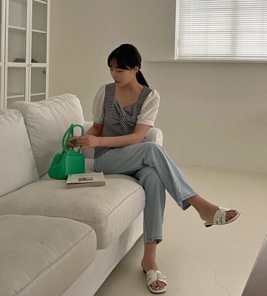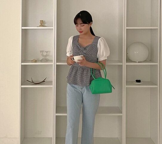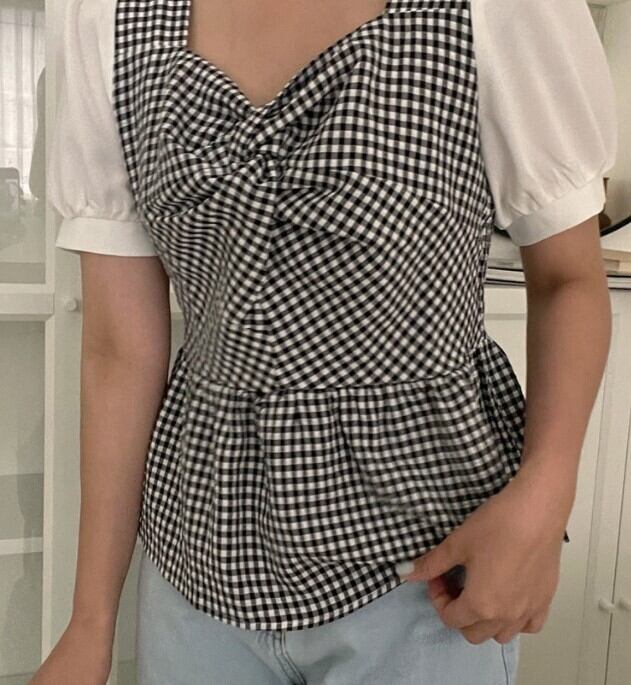 トップス ブラウス 袖あり 半袖 ボリューム袖 パフスリーブ 襟なし フレア 切り替えデザイン かわいい カジュアル おしゃれ お洒落 キュート ガーリー 主役級 存在感 チェック柄 格子柄 春 夏 10代 20代 レディース 女性用 学生 通学 デート お出かけ 女子会 お泊まり 休日 アウトドア イベント リゾート 旅行 海 プール ガーデン レストラン ショッピング 着回し 普段使い 韓国 韓国系 オルチャン ファッション コーデ スタイル 楽ちん 体系カバー 黒 水色