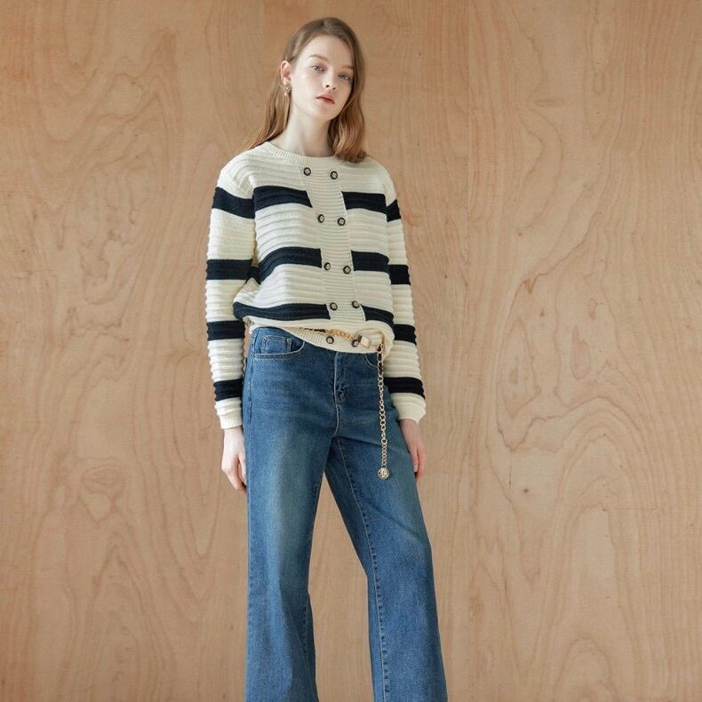 ダブルブレストデザインとボーダーが大人マリンコーデにぴったりなニットトップス。