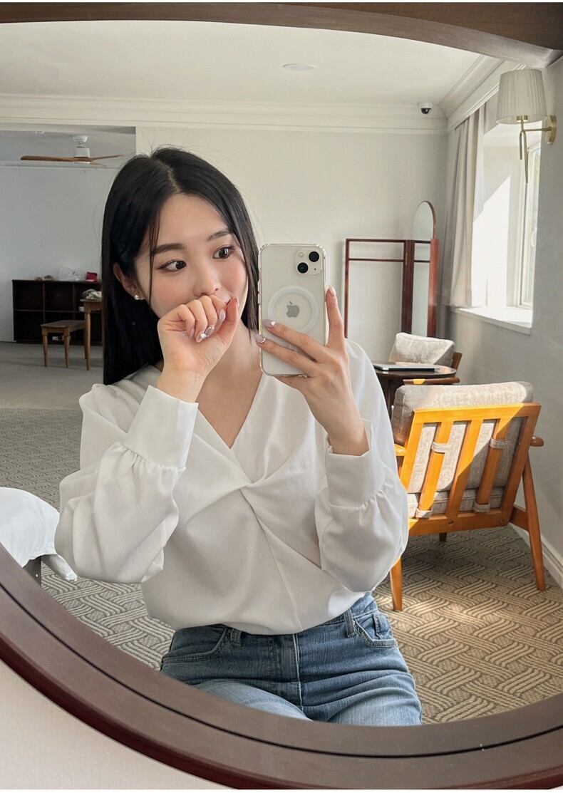 清潔感溢れるシャツブラウス。パフスリーブが華やかさをプラスし、胸元のひねりデザインがデコルテを綺麗に見せてくれます。デートやお出かけ、フォーマルな場面まで、幅広く活躍します。