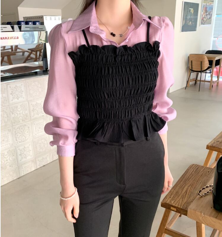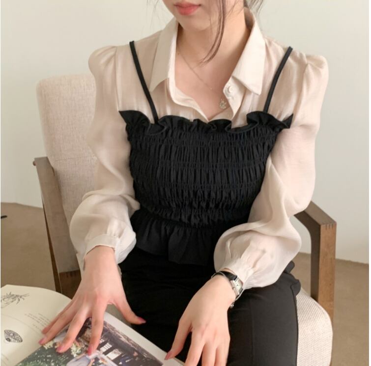 フェイクツーピース トップス Tシャツ シャツ ブラウス 袖あり 長袖 パフスリーブ Vネック 襟付き スリム 細身 ストレート Iライン かわいい 大人可愛い きれいめ シンプル カジュアル 大人 上品 おしゃれ お洒落 大人女子 こなれ感 ラフ ガーリー クール モード系 エレガント モダン 主役級 存在感 無地 春 秋 10代 20代 30代 40代 レディース OL 学生 通学 デート お出かけ 公園デビュー 女子会 イベント リゾート 旅行 ホテル レストラン 普段使い ファッション コーデ