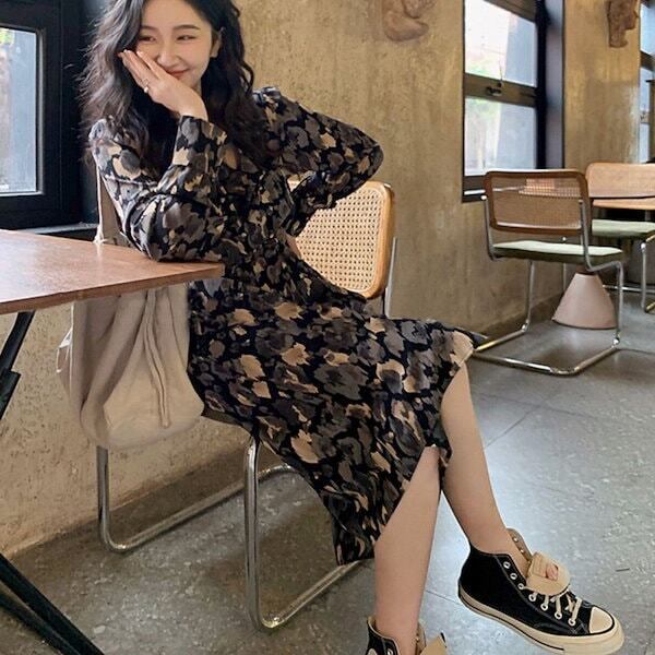 ワンピース ロングスカート ワンピドレス 膝下 ミモレ ミモレ丈 ロング ロング丈 袖あり 長袖 パフスリーブ Vネック 襟なし Aライン 切り替えデザイン ハイウエスト 大人可愛い きれいめ シンプル 大人 上品 おしゃれ お洒落 エスニック エキゾチック 大人女子 こなれ感 個性的 クール モード系 エレガント 存在感 フォーマル 柄 春 夏 秋 10代 20代 30代 40代 50代 60代 レディース OL 通勤 デート ファッション コーデ 体系カバー S M L XL 黒 ブラック 大人カラー
