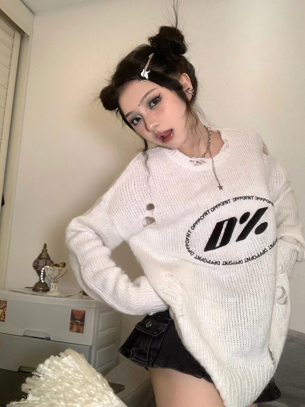 長袖セーター ストリート ダメージ トップス ニットソー セーター 白トップス 袖あり 長袖 萌袖 襟なし 透け感 伸縮性 ニット 薄手 カジュアル おしゃれ かっこいい エキゾチック こなれ感 ラフ メンズライク マニッシュ ボーイッシュ ルーズ 個性的 モード系 セクシー とろみ感 抜け感 プリント 春 10代 20代 30代 通勤 学生 通学 デート お出かけ 公園デビュー 女子会 休日 リゾート 旅行 ガーデン 普段使い 穴あき 体系カバー インスタ映え M L XL ゆったり ゆる 白 ホワイト