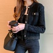 ケーブル編みのデザインに、上品なパールボタンがエレガントで女性らしい印象を与えます!