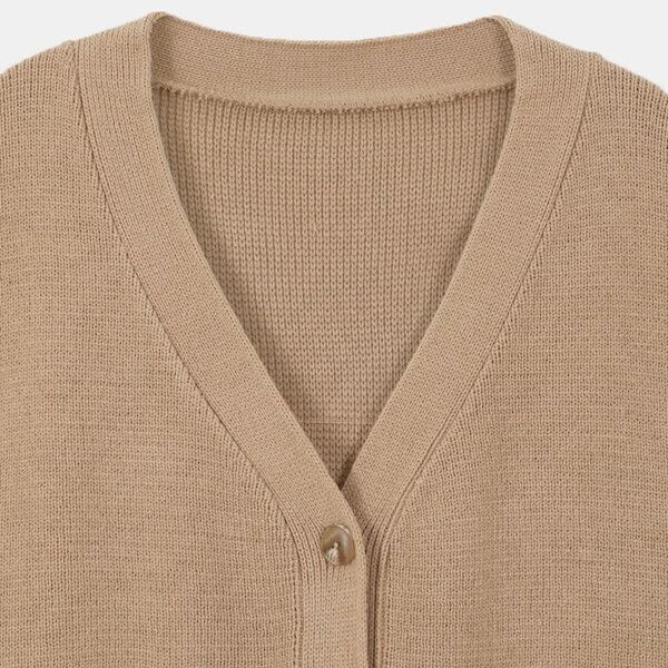 また、Vネックとフロントスリットでデコルテラインをキレイに見せ、前開きとポケットでおしゃれなアクセントをプラス。リブニット素材が体のラインを美しく見せてくれます。