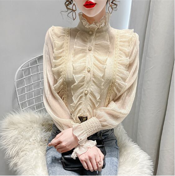 ブラウス シャツ スタンドカラー 袖あり長袖 襟付き フリル 襟フリル 袖フリル 透け感 シースルー ハイネック レディース 上品 ガーリー レトロ きれいめ かわいい 大人可愛い お洒落 おしゃれ 大人女子 エレガント コーデ モテ デート 着回し デイリー 日常使い 韓国 オルチャン クラシック 定番 ベーシック 華やか ゴージャス 存在感 主役級 個性的 こなれ感 抜け感 学校 通学 通勤 オフィス 20代 30代 40代 春 秋 冬 S M L XL 白 ホワイト 黒 ブラック アイボリー